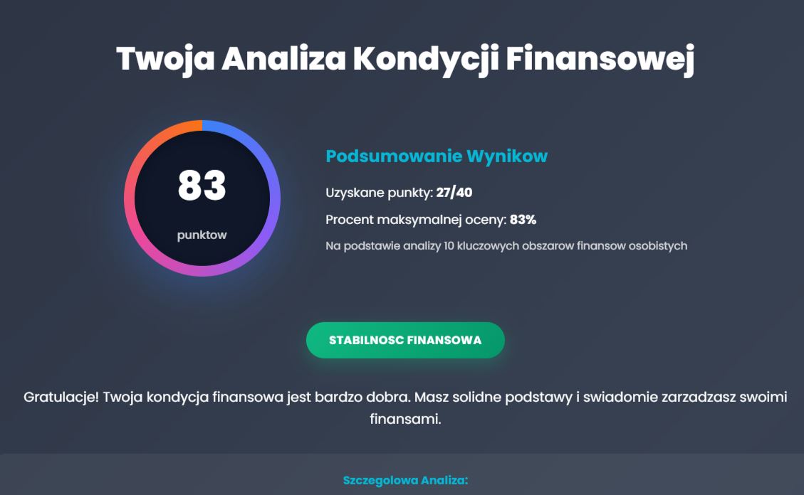 Szczegółowy raport z oceną każdego obszaru, spersonalizowanymi rekomendacjami oraz priorytetami działań dostosowanymi do Twojej sytuacji finansowej.